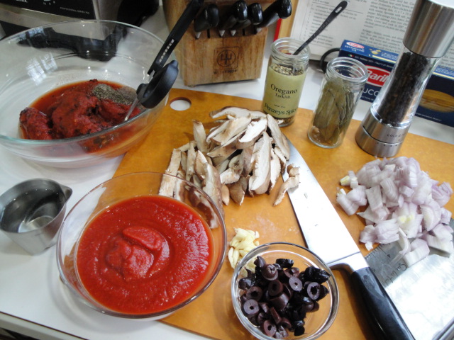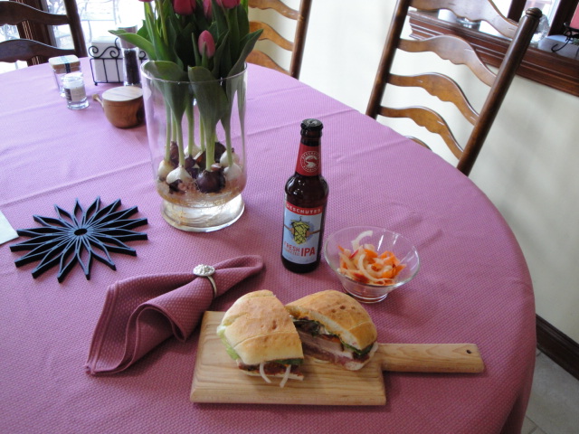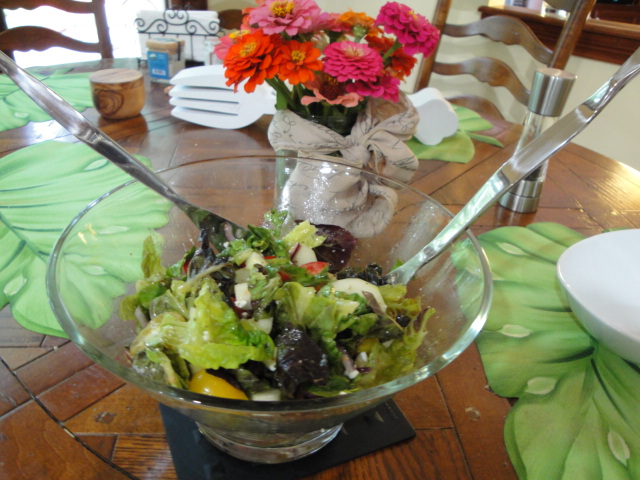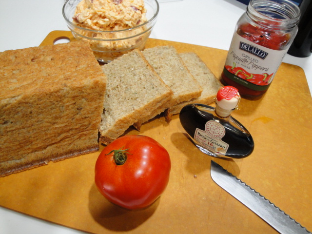 The recipe originates from a February 2011 Cuisine magazine article on Meatless and Delicious and that it certainly is. In the article the stuffed peppers are paired with a Black Bean Sauté which is also delicious but for tonight’s meal I’m pairing them with some simply grilled boneless, skinless chicken thighs and fresh off the vine cherry and grape tomatoes. Our dog looks sooo sad because he knows that although he can enjoy the aromas, he won’t be getting a bite!
