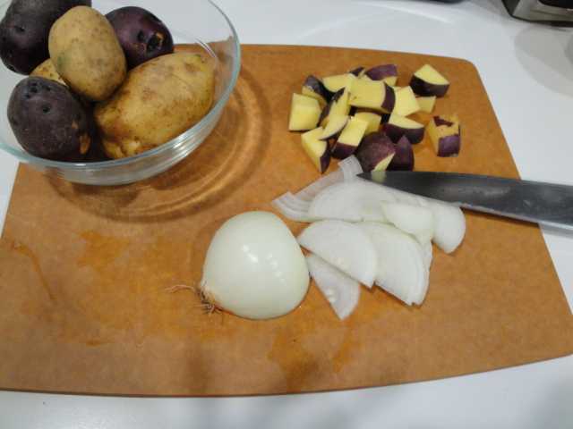 When I’m making mashed potatoes, I usually want a russet like variety, but in this recipe they will be more of a smash, so even potatoes that are of the waxy variety will be fine. It’s a dice for the potatoes and a slice for the onion.