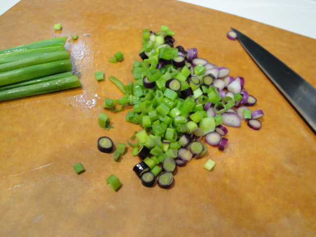 While the peppers are steaming, slice the scallions and grate the cheese. Check out those beautiful purple scallions from Clay Hill Farms. Use both the white/purple part and the green stems. I forgot the shot for mincing the jalapeno, but you should be doing this now as well.