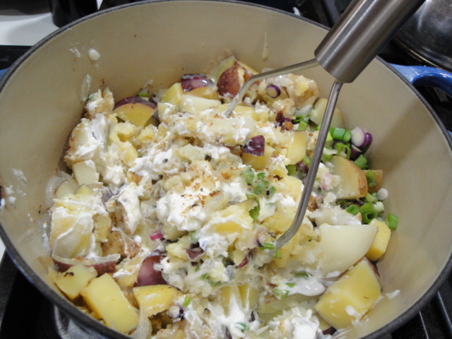 Add approximately 3/4 of the shredded cheese, the scallions, jalapeno, cream cheese, sour cream, garlic powder and cumin and mash/smash. I like mine on the chunky side but if you like smooth just keep on mashing until you get the texture you like. Taste and season with salt and pepper and lime juice if you like. If you salted the potato water well you shouldn’t need any additional salt.