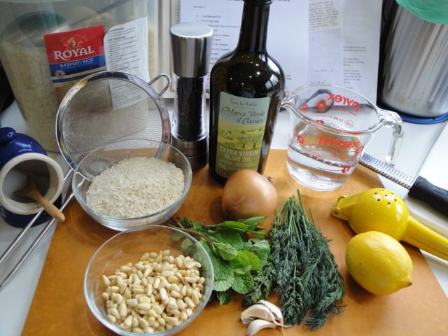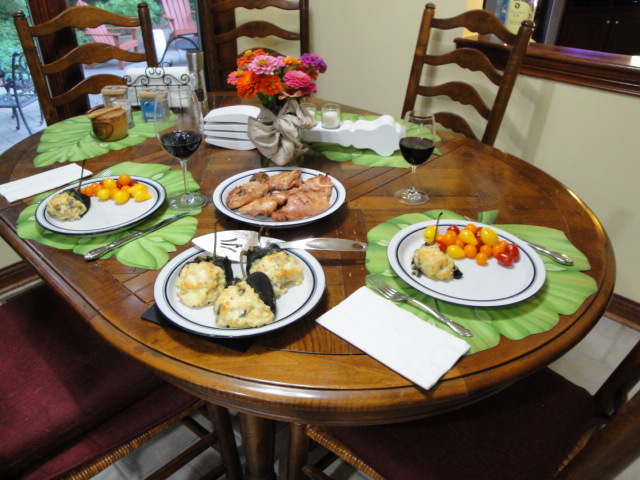 If you’re having a meatless day, a side of Black Beans (there’s a very nice recipe for Black Bean Sauté that accompanied the original recipe in Cuisine) is all you need for the center of the plate. Tonight I’m pairing mine with a grilled boneless, skinless chicken thigh and a handful of cherry (Sun Gold) and grape tomatoes from my CSA and garden. And of course a glass of wine! The flavors here are bold enough for a light red. The contrast of the warm, earthy stuffed peppers and the bright fresh flavors of the cherry tomatoes (no need for any embellishment on them) makes for a fine late summer meal.