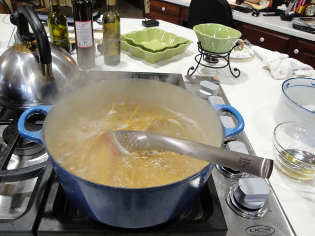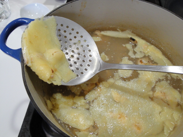Into a pot of salted water they go. Always start potatoes in cold water so the will cook evenly.