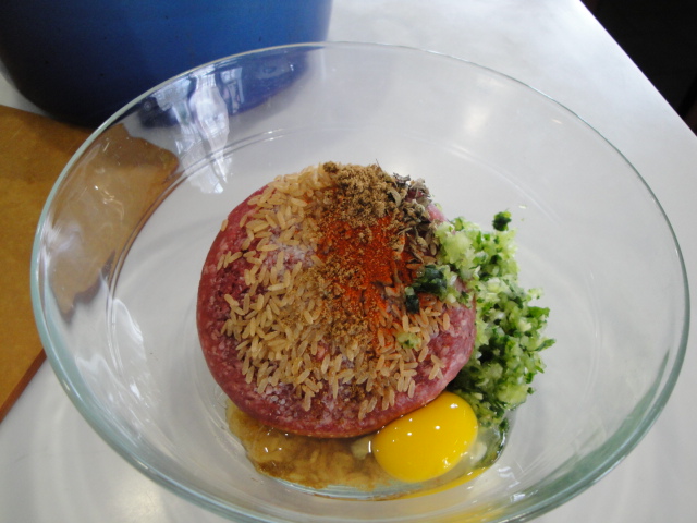 Garlic, onion, cilantro, lean ground beef, egg, salt, pepper, Mexican oregano, cayenne pepper, cumin and uncooked rice