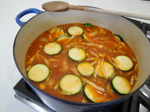 Remove the lid, add the cabbage and squash (in a double batch I like to use one zucchini and one yellow squash) and simmer uncovered for an additional 10 minutes or until the squash is just tender.