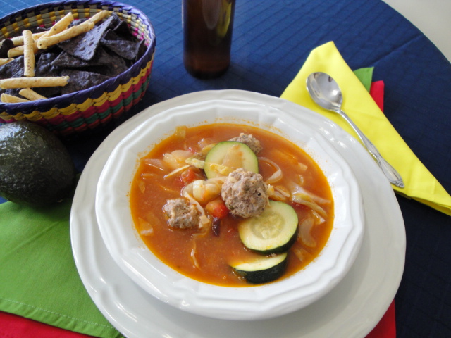 This first recipe however is one that I do consider my own and I’ve spent many years perfecting it.  As with many of the great recipes in life it came about as the necessity of invention.  In the 80’s and 90’s I had the good fortune of living in Southern California where Mexican food was wonderful and inexpensive-i.e. no need to cook your own.  On nearly every Friday our family and friends would get take out from Alamo Rotisserie in Granary Square.   One of the of the staples we ordered at the request of my son was the Albondigas Soup. Loaded with lots of flavor and vegetables it was a working mom’s dream.   When we moved to Columbus Ohio in 1994 – no Alamo and no soup to be found!!  So I set about creating a soup from my flavor memory with the ingredients I could find at hand.  Today I’m giving you the scaled down version of the soup that I’ve been making a minimum of two or three times a year for the last 20 odd years.  At one point I purchased a 16 qt stock pot to hold the quantity required to feed the many people at my table for at least two meals.  The scaled down version will still make 6 to 8 servings, but trust me, as with most soups of this style it just gets better on the 2nd or 3rd day, so don’t worry that it’s still a lot of soup.