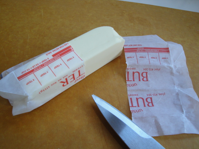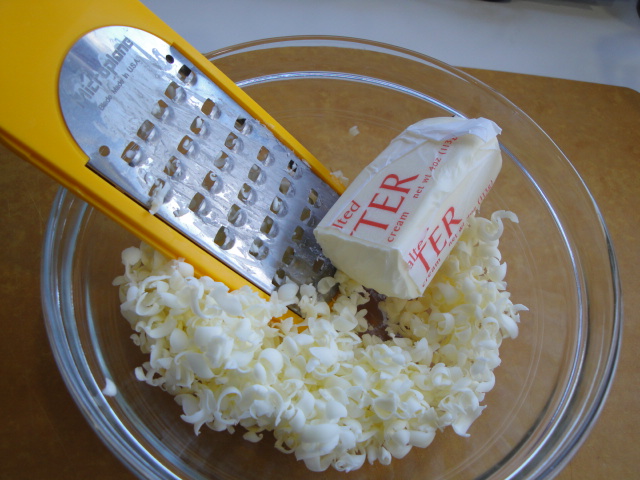 As I said I  wanted to give the method of coarsely grating the butter a try, so I pulled out one of my favorite tools, the Microplane grater.  This one is the Extra Coarse model.  It’s always difficult to grate the last bit of anything with out taking a bit of a knuckle or finger, so I took the stick of frozen butter and trimmed away the paper wrapper to reveal the proper measurement (4 Tbsp.) for this recipe.  This left me with a safe and easy way to grate the correct amount without endangering any body parts!