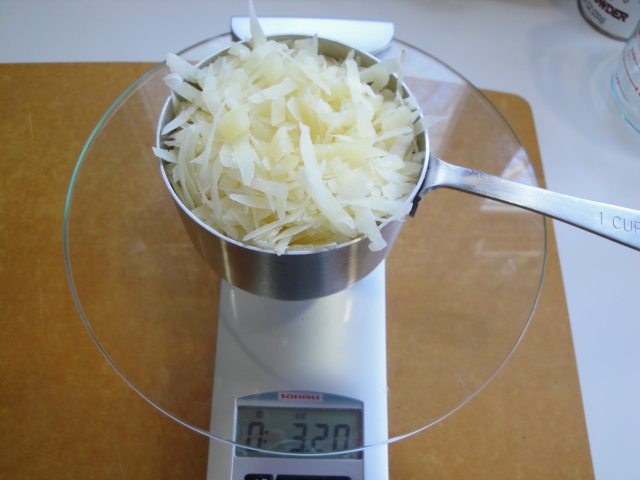 The standard weight/volume ratio for grated cheese is 4 oz.= 1 cup.  In the case of this type of cheese and this size of grate/shred, I get  3.2 oz. in a fairly packed cup.  Normally I wouldn’t care so much about a bit of cheese here and there, but this is baking!  So if you have a kitchen scale pull it out!