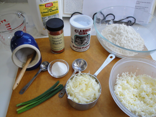 My daughter wanted a cheese scone but I convinced her that Raisin were more “authentic” and that I would make her some cheese ones when we returned home.  Why I didn’t let her have her own cheese scone still evades me to this day!! In any case I’ve made quite a few batches of Cheese Scones over the years and there are several in my tried & liked file, but none that ever truly satisfied me.  Many cheese scones contain cheddar cheese and chives. A good combo for sure, but at the moment, Manchego is on my favorite cheese list and smoked paprika is a flavor I enjoy in many dishes these days.  Most important of all however, these are the ingredients I happen to have on hand.   As you will learn as this blog continues, I’m trying hard to eat locally and in season.  So when my chives are buried under snow it’s time to move on to another flavor profile.