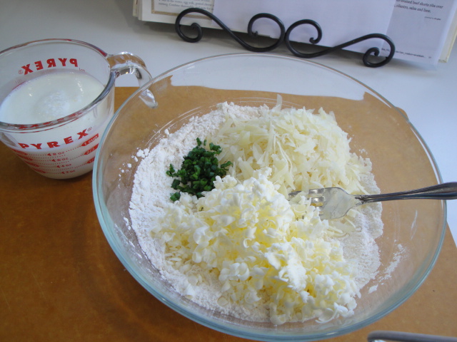 Next add the grated butter and cheese and chives/green onions/parsley. Stir them together quickly to evenly distribute the butter and cheese.