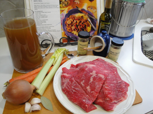It starts with some Flank Steak, Onion, Carrot, Celery, Garlic, Cumin, Oregano, Bay Leaf, Black Peppercorns, Beef Broth, Olive Oil and Salt