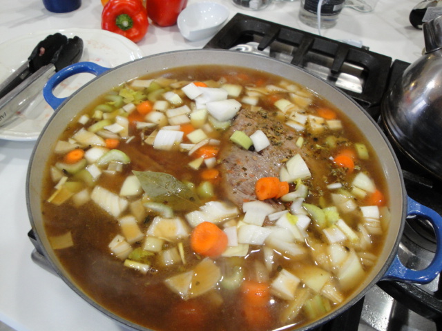 Add the beef broth, bring to a simmer and cover and cook for at least 1 ½ hours, or until the meat is tender.