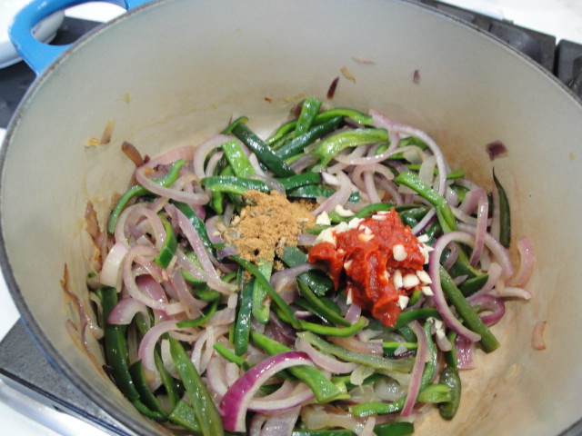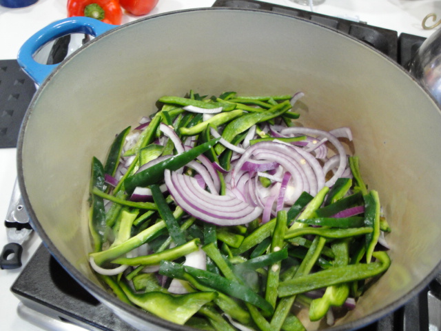 Going back to the pot where you sautéed the first set of peppers (so maybe it’s not a one pot dish, but two pots for one great dish isn’t so bad), add the olive oil and the peppers that you’ve cut into ¼ inch strips.  Cook them until they are just tender.