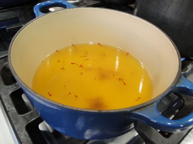 Crumble the saffron into a small pot.  I use a 1.5 quart Dutch Oven (yes I do love my Le Creuset) and heat until the saffron becomes a bit more brittle.  Add the chicken broth, bring it to a boil, add the orzo and give it a good stir