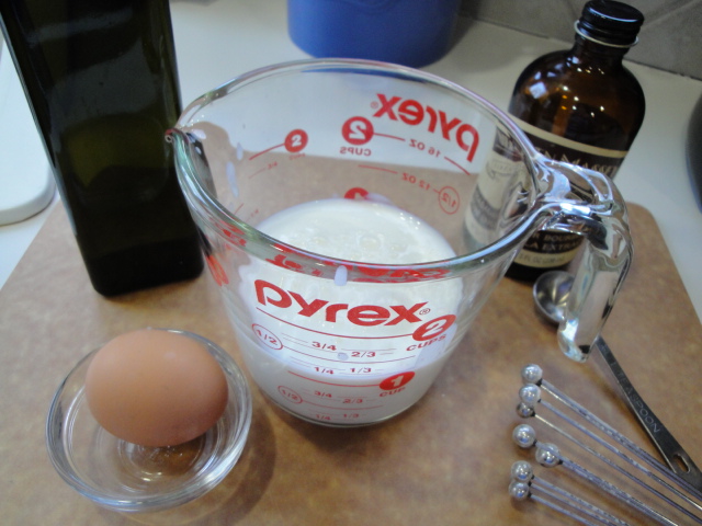 Measure the buttermilk in a 2-cup or larger glass measuring cup. Add the egg, vanilla and oil. Beat with a fork or whisk to blend.