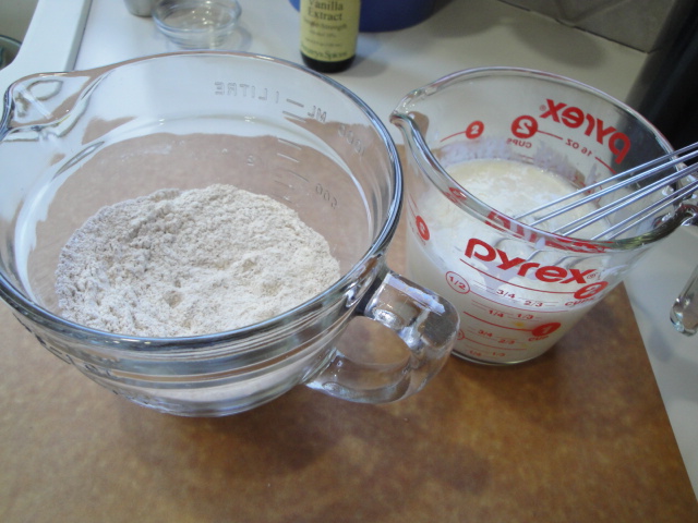 Ingredients : Flour (half whole wheat and half all purpose), sugar, baking powder and soda, cinnamon,salt, buttermilk, egg, vanilla & oil.