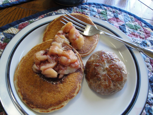 My personal favorite toppings are sautéed apples and a drizzle of berry syrup with a side of sausage but real maple syrup and bacon have a following at my table as well. Oh and don’t forget the mug of hot Nestlé Quik.
