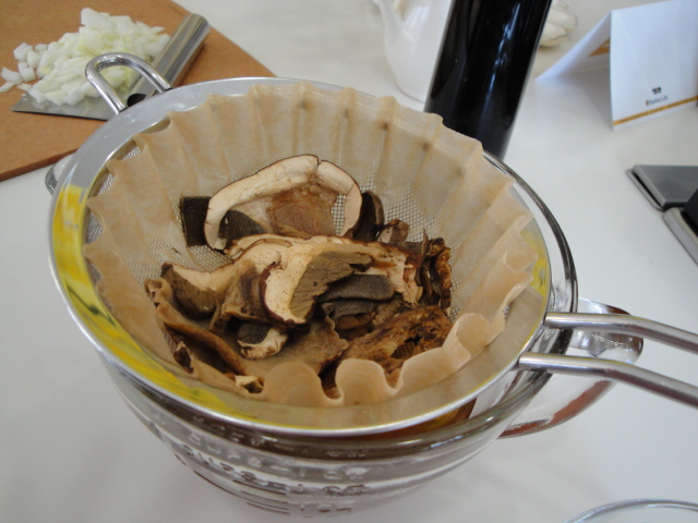 After soaking,  the mushrooms should be soft and pliable and the soaking water a rich brown color.  Transfer them to a mesh strainer lined with a coffee filter.  If you don’t have either of these, no worries.  Simply lift the mushrooms out with a slotted spoon or fork.  The goal is to have grit free mushrooms and mushroom “stock” .