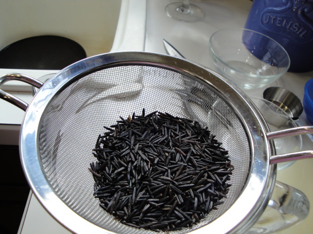 To pair with the Duck I often go with some type of Wild Rice as a side dish.  Somehow in my mind Duck and  Wild Rice go together.  Perhaps it’s from watching ducks swimming around on the lakes of Northern Minnesota where the best wild rice is grown.   The recipe here takes a slightly different tack on cooking a combo of rice types.   The inspiration for the recipe comes from a Gourmet 2002 recipe for Wild Rice and Toasted Almond Pilaf.  After making it once, as written and finding it a bit lacking,  I took some of the suggestions by some of the 20 other reviews and punched it up a bit in flavor and changed the cooking method from pilaf to risotto technique.   The cooking time wasn’t reduced much from the original (natural wild and brown rices just take time) but I preferred the finished texture. It’s not exactly like a classic risotto from Arborio rice because the starches are so different,  but pretty darn tasty.