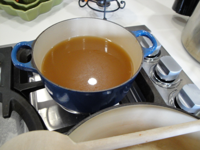 Combine the mushroom soaking liquid and the chicken broth in a sauce pan and bring to a low simmer.