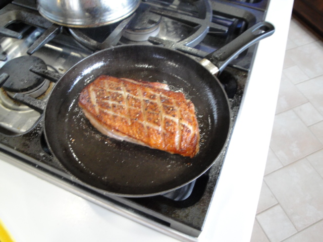 Flip the breast over, turn the heat up a bit and sear on the flesh side for another couple of minutes.