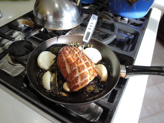 Scatter the onion, garlic (whole cloves with outer skin on), and herbs around the breast and put into the pre-heated oven for 15 to 20 minutes.