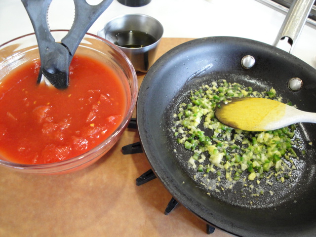 Transfer the roasted peppers to a glass bowl, cover them with plastic wrap and let them steam for 10 minutes or so. Once they are steamed enough to loosen the skins and they are cool enough to handle. Peel the blackened skin off (don’t rinse), cut a slit along one side of the pepper and remove the seeds and any tough veins. Set aside.