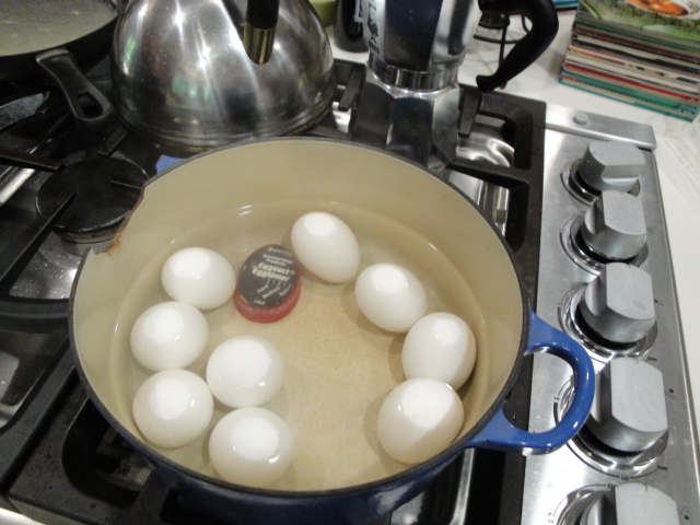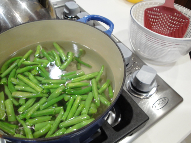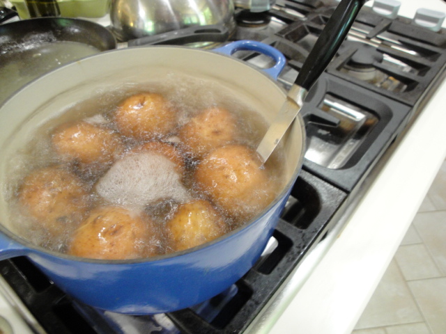 Into a pot of salted water they go. Always start potatoes in cold water so the will cook evenly.