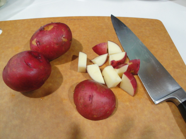 I’m using a combo of “red” skinned (Blue Gold from Wayward Seed Farms) and white potatoes (Kennebec from Dangling Carrot Farms), but in this recipe most any type of potato will work. But, remember the better quality the ingredients, the better the dish. So if at all possible look for some high quality potatoes at your local farmers market.