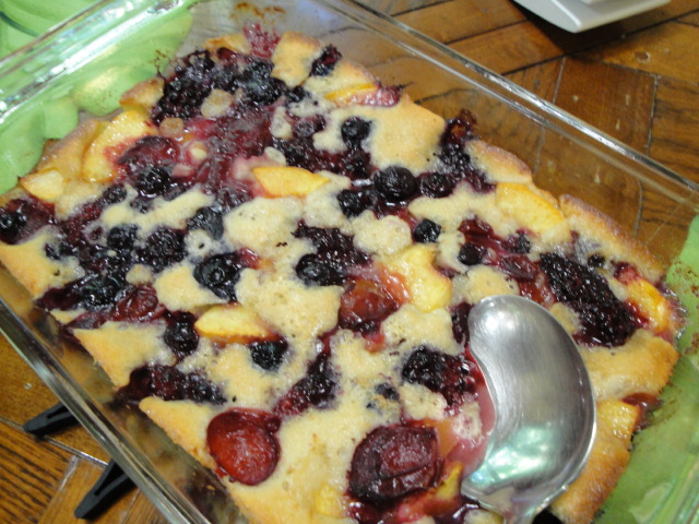 It’s been a busy few weeks with little time for taking pictures or writing but this morning I realized I had both a little time and several bits of fresh fruit from my Great River Organics CSA (Community Supported Agriculture) on hand and Fruit Cobbler popped into my mind. The recipe is based on one I got from a good friend and former colleague Carrie Sears. It’s with her that I first experienced the joys of CSA membership. We shared a Wayward Seed CSA share for several years and not only was it great to enjoy the fresh, locally grown produce but we also got to share recipes and ideas of what to do with our bounty. On one particular week we were discussing what to make with the lovely plums we had just gotten in our bag and she told me about the Fruit Cobbler she made. This version of Cobbler is much easier than the Cobblers I grew up with which consisted of a large rectangular pan of fruit topped with a pastry crust. Not that making a pastry crust is time consuming or difficult but this type of cobbler is even easier and ever so tasty. So when you have a bit of extra fruit on hand and are craving something sweet, this could be on your table too.